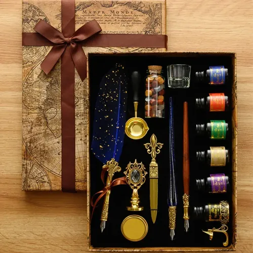 Classic Calligraphy Feather Pen Wax Ink Seal Stamp Set Vintage Wood Dip Pen 6Pcs Ink Bottles Gift for Students Adult Supplies